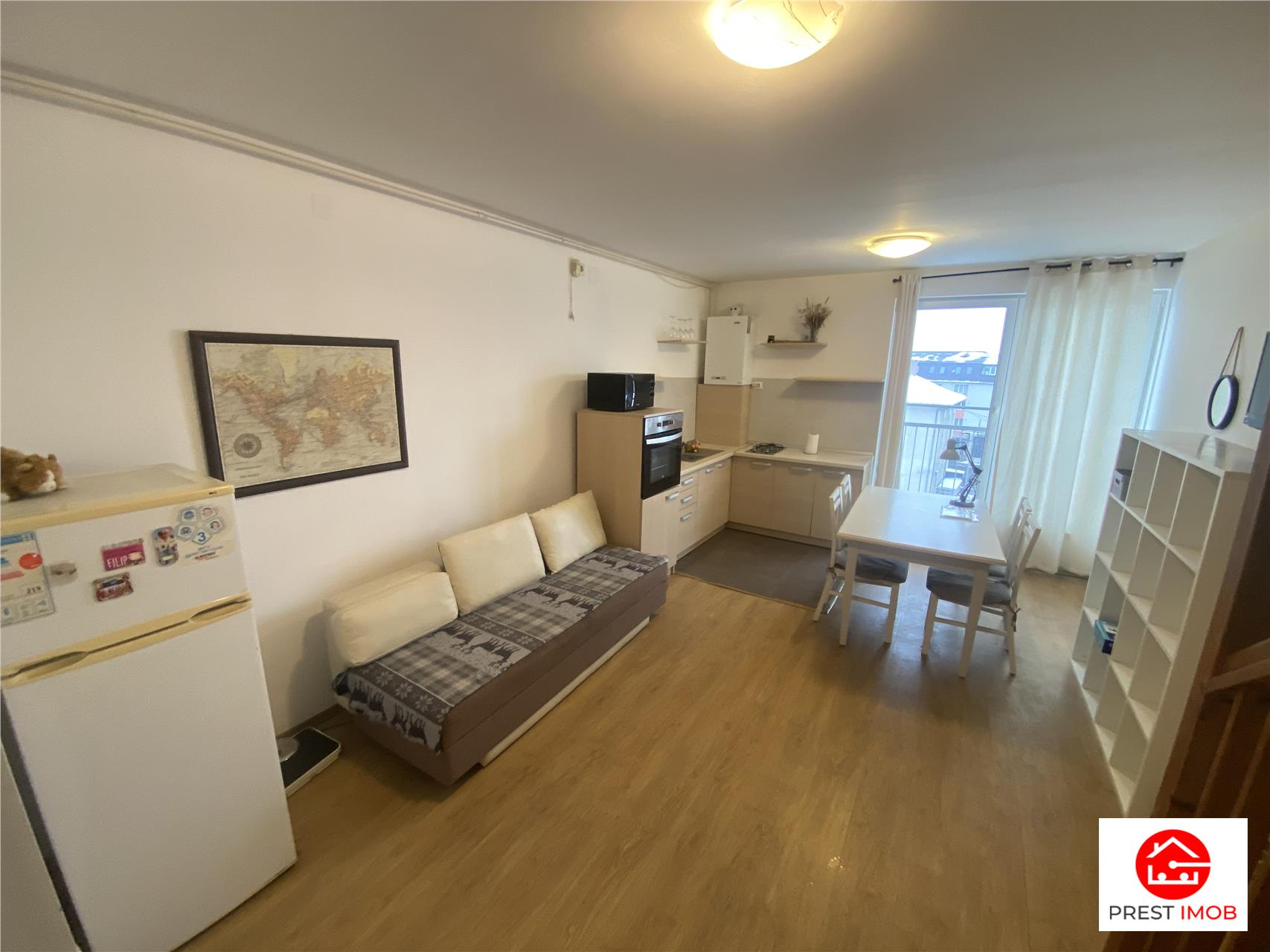 Apartamentul este compus din living cu bucatarie open space si o baie la parter, iar la etaj o camera. Este mobilat si utilat complet, dispune de centrala termica proprie, aer conditionat, ferestre termopan, masina de spalat rufe, frigider, cuptor cu microunde etc. Se inchiriaza doar pe termen lung.